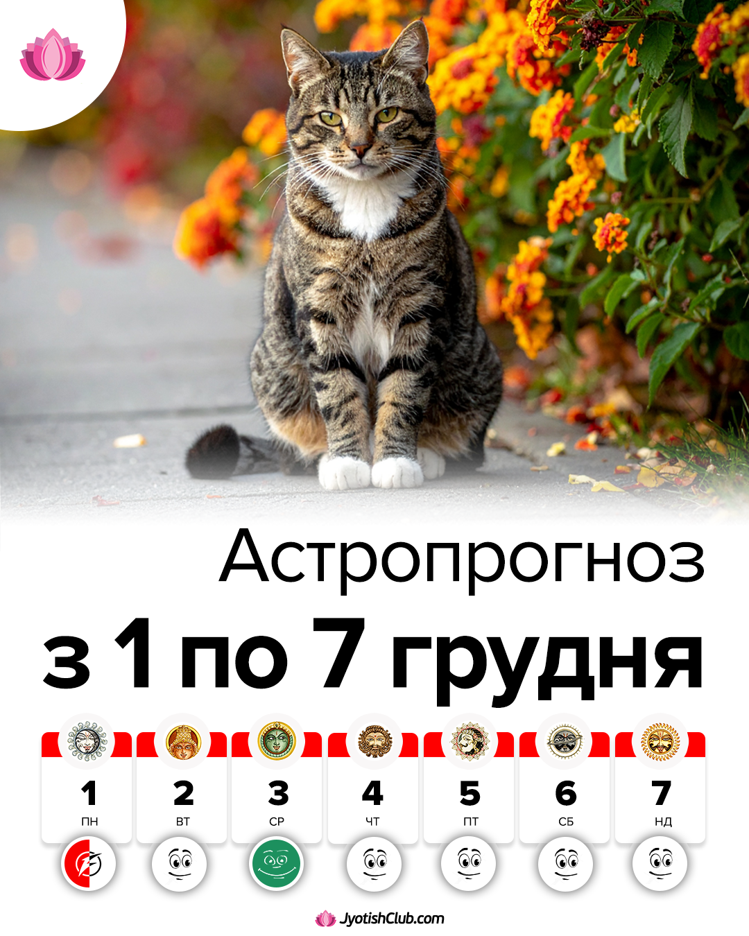 Друзі, нас чекає в цілому нейтральний тиждень. Напруженим днем буде перша половина понеділка (1 грудня). Середа (3 грудня) буде сприятливим днем. Весь інший час пройде в нейтральних енергіях.  До четверга, 4 грудня, 05:09 за київським часом ми будемо проживати фазу зростаючого Місяця. У період зростання Місяця рекомендується займатися справами, в яких потрібне зростання, розвиток і […]